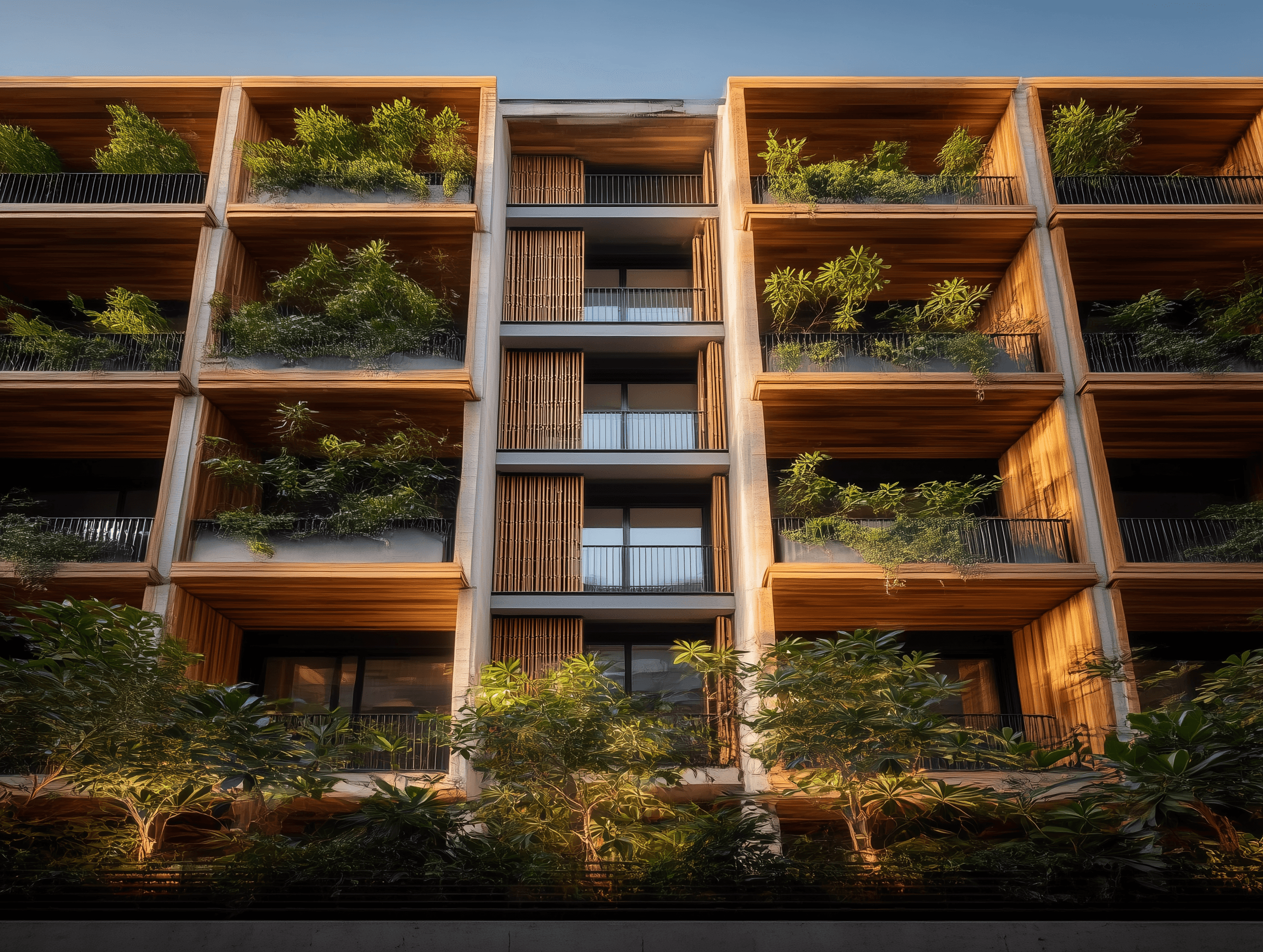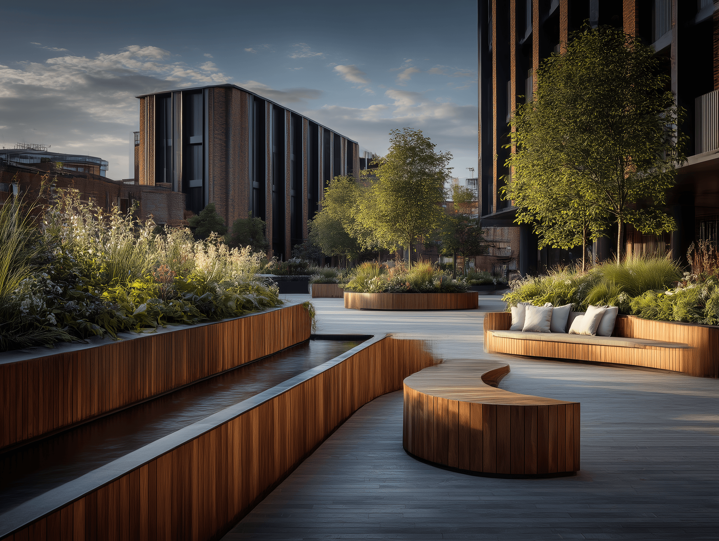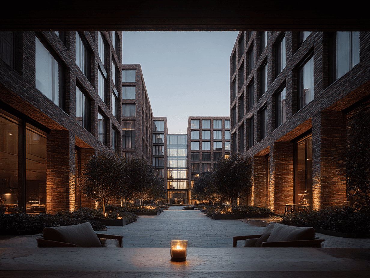 Green roofs, rainwater harvesting, and geothermal heating systems reduce environmental impact. Brick construction provides thermal mass. Car parking is underground, keeping the surface level entirely pedestrian.